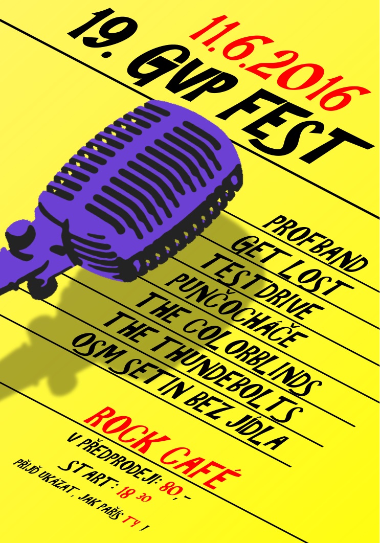 Je mi ctí pozvat vás na již 19. ročník našeho slavného GVP festu! Přijďte si všichni 11. 6. 2016 vychutnat atmosféru této již tradiční události a se svými přáteli, rodiči či profesory (nebo klidně s někým úplně jiným) si užijte večer, na který někteří nezapomenou, jiní zapomenou po velmi dlouhé době a někteří si ho nebudou téměř vůbec pomatovat. Akce bude probíhat opět v oblíbeném Rock Café! Vstup bude 80 předprodej a 100 na místě. Tak přijď ukázat, jak paříš ty!