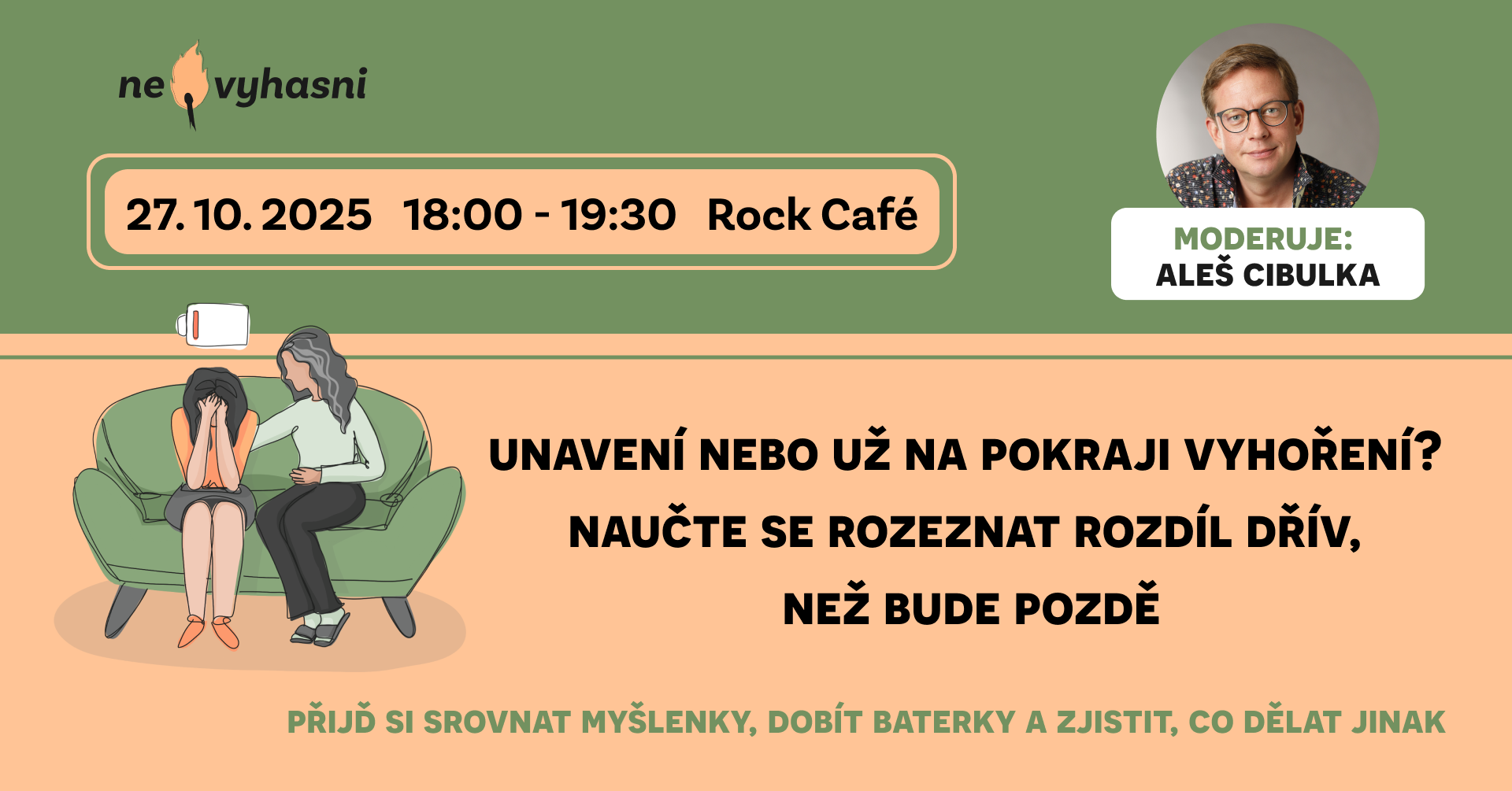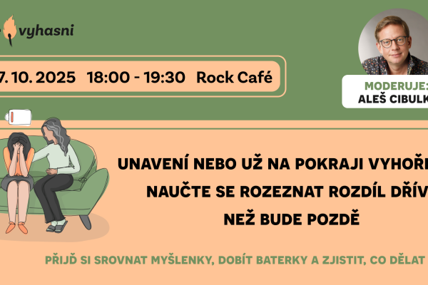 Večer na téma vyhoření a jeho prevence s Alešem Cibulkou a Anetou Kostkovou se uskuteční 27. října 2025 v Rock Café, kde se návštěvníci dozví, jak rozlišit únavu od vyhoření a jak s ním vědomě pracovat.